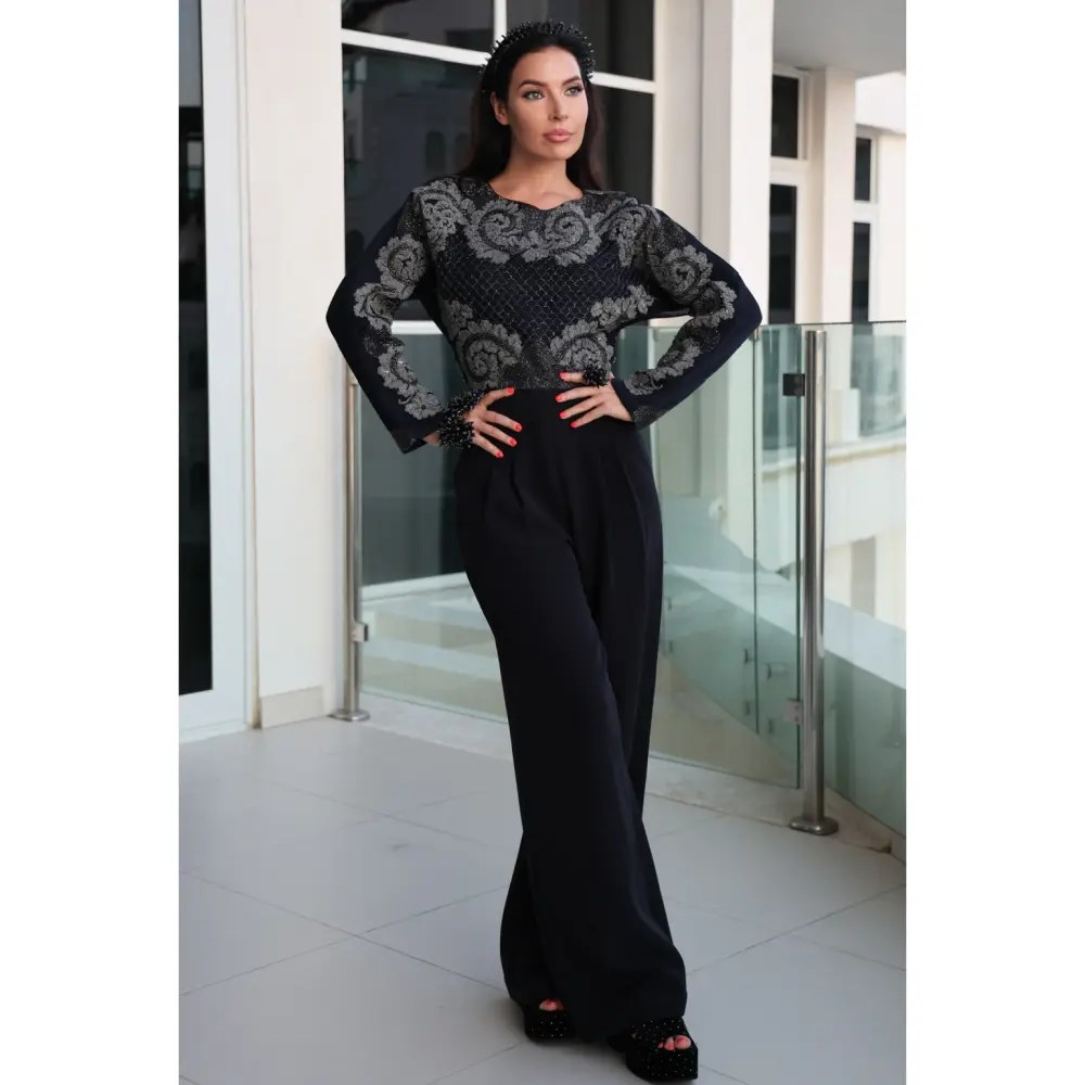 Evening Glam. Choose a black sequin top and pair it with black wide-leg trousers for a glamorous evening look.Elevate the outfit with black heels and accessorize with statement black earrings for a touch of elegance.