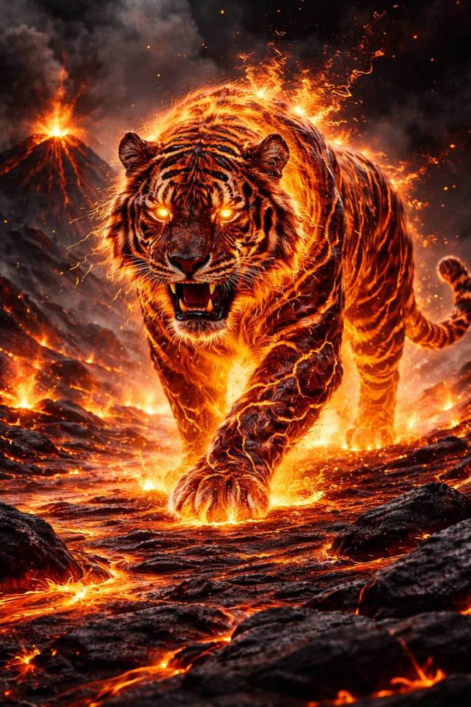 A realistic photo of a tiger made entirely of flowing, glowing lava, with intricate details and a fiery aura, set in a volcanic environment. --ar 7:4 --v 6.1