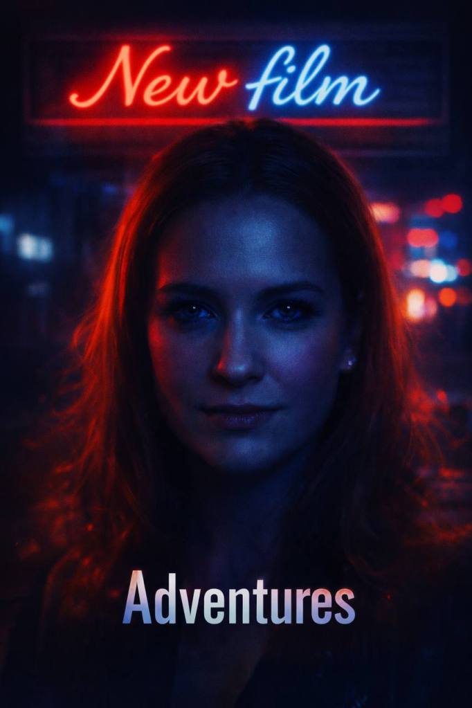“Make this selfie into a neo-noir film poster: deep shadows, neon sign in the background, cinematic color, slight background blur, preserve facial features. Title – New Film, Adventures”.