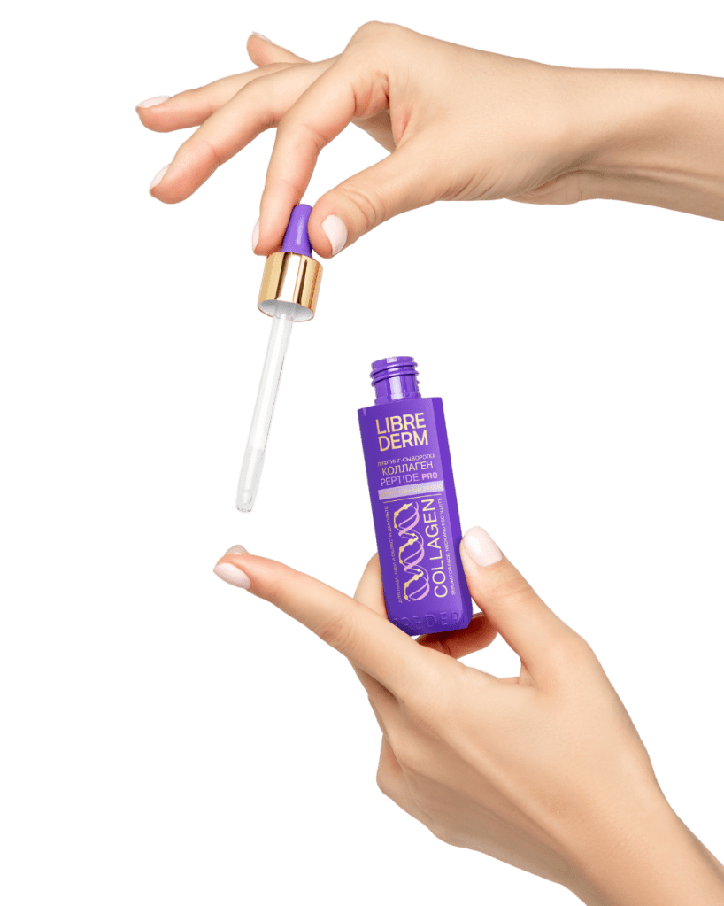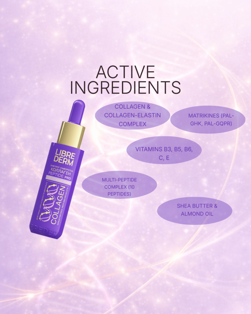 Collagen + elastin complex, matrikines (Pal-GHK, Pal-GQPR), 10-peptide complex, nourishing oils, and a powerful vitamin blend (B3, B5, B6, C, E)